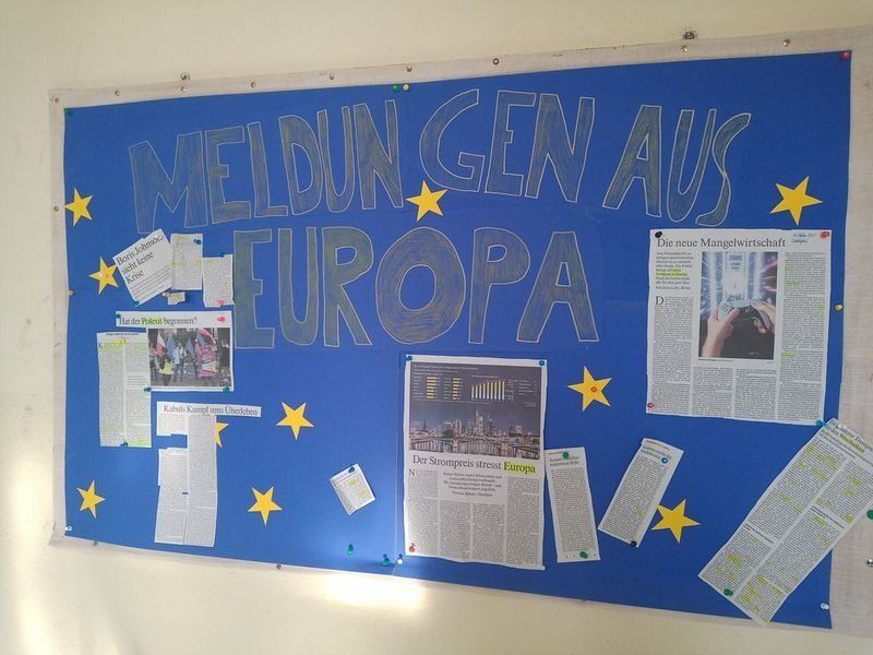 „Meldungen aus Europa“ stellte der Grundkurs GRW der Klasse 11 mithilfe eines Wochensatzes der Frankfurter Allgemeinen Zeitung zusammen. Auf einem großen Wandplakat sammelten sie Berichtenswertes aus mannigfachen Rubriken der Zeitung – alles mit Bezug zu Europa. So konnte die europäische Interdependenz anhand verschiedenster Artikel nachgewiesen werden.