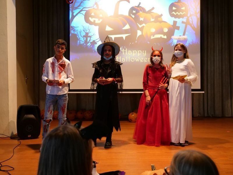 Den Abschluss der Mottowoche bildete die Halloween-Party für die 5. und 6. Klassen in der Aula. Dass Halloween seinen Ursprung in Irland hat, vergisst man leicht. In gruseligen Kostümen, versorgt mit schaurig-schmackhaften Snacks, konnte die Party starten. Neben einem Kostümwettbewerb, dem Kürbis-Schnitz-Workshop, einem Halloween-Quiz galt es auch in kurzer Zeit, die beste Mumie zu erschaffen – mithilfe einer Rolle Toilettenpapier. Vielen Dank an die Klasse 7s, die die Halloween-Feier vorbereitet und unterstützt hat.