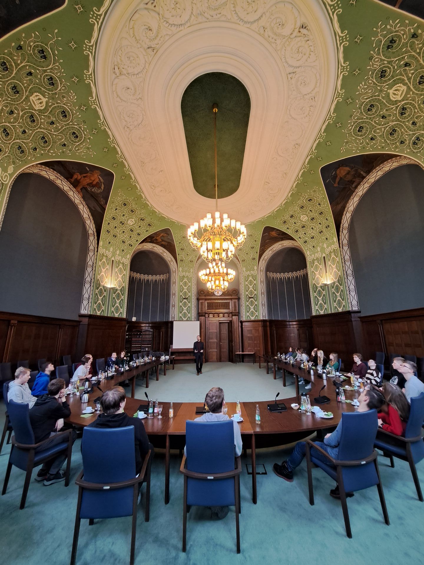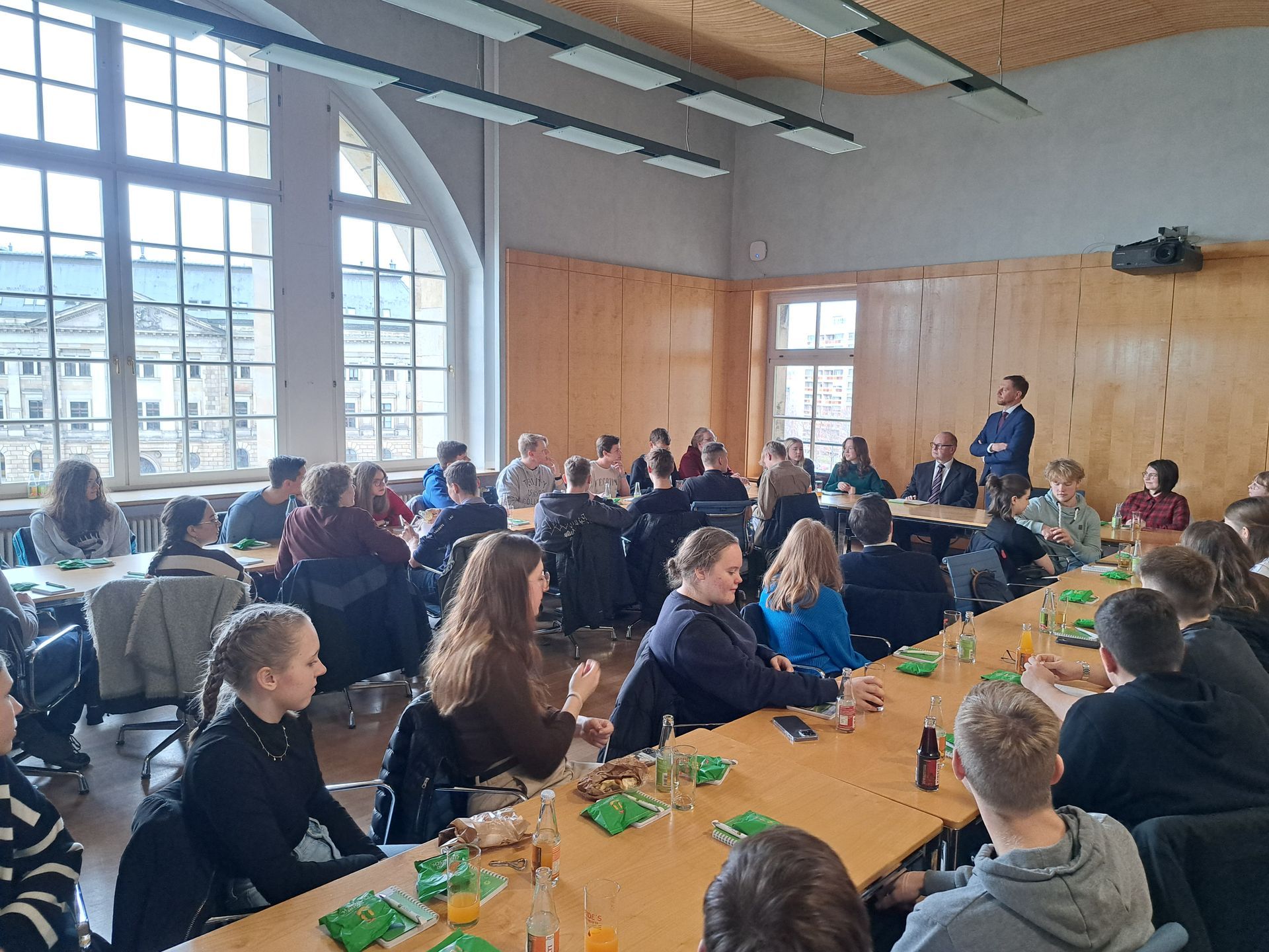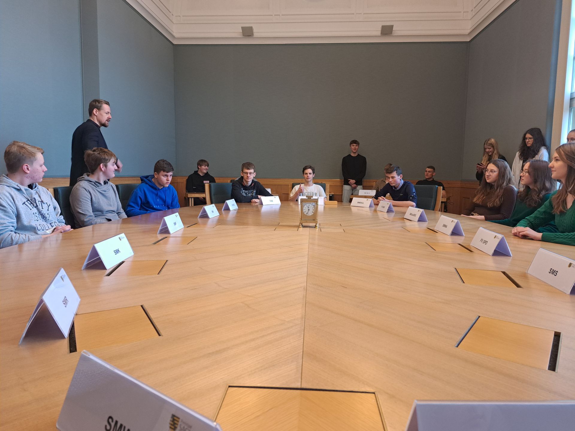 Was Ministerpräsident Kretschmer mir am 7.9. 2022 beim Bürgerdialog in der Aula des Werner-Heisenberg-Gymnasium Riesa mit seiner Einladung versprach, wurde am 11.1.23 Wirklichkeit. So traten 53 Schüler der 11. Jahrgangsstufe die Reise von Riesa in die Landeshauptstadt an. In der Staatskanzlei angekommen, stand zunächst eine Führung durch das Gebäude auf dem Programm.