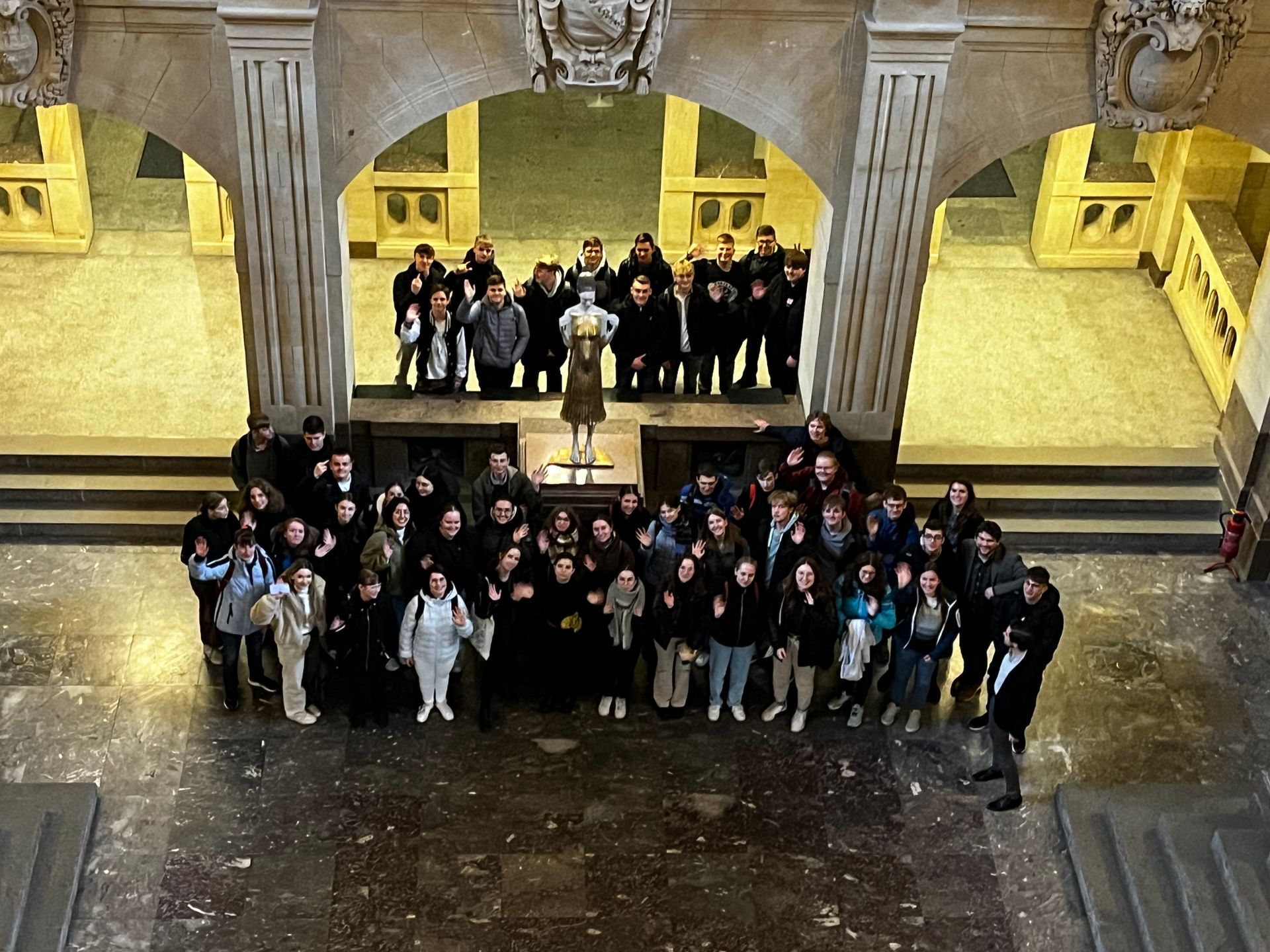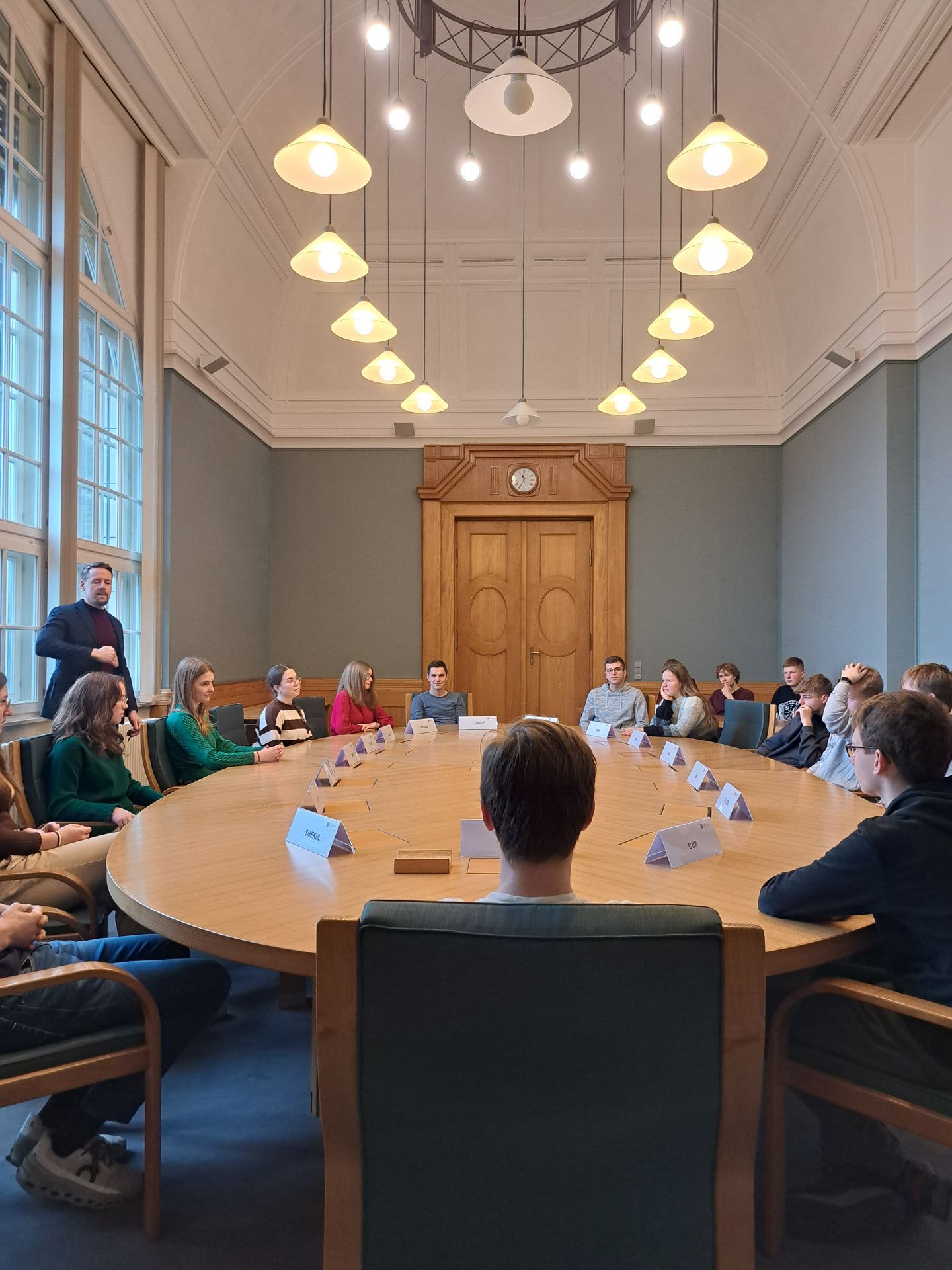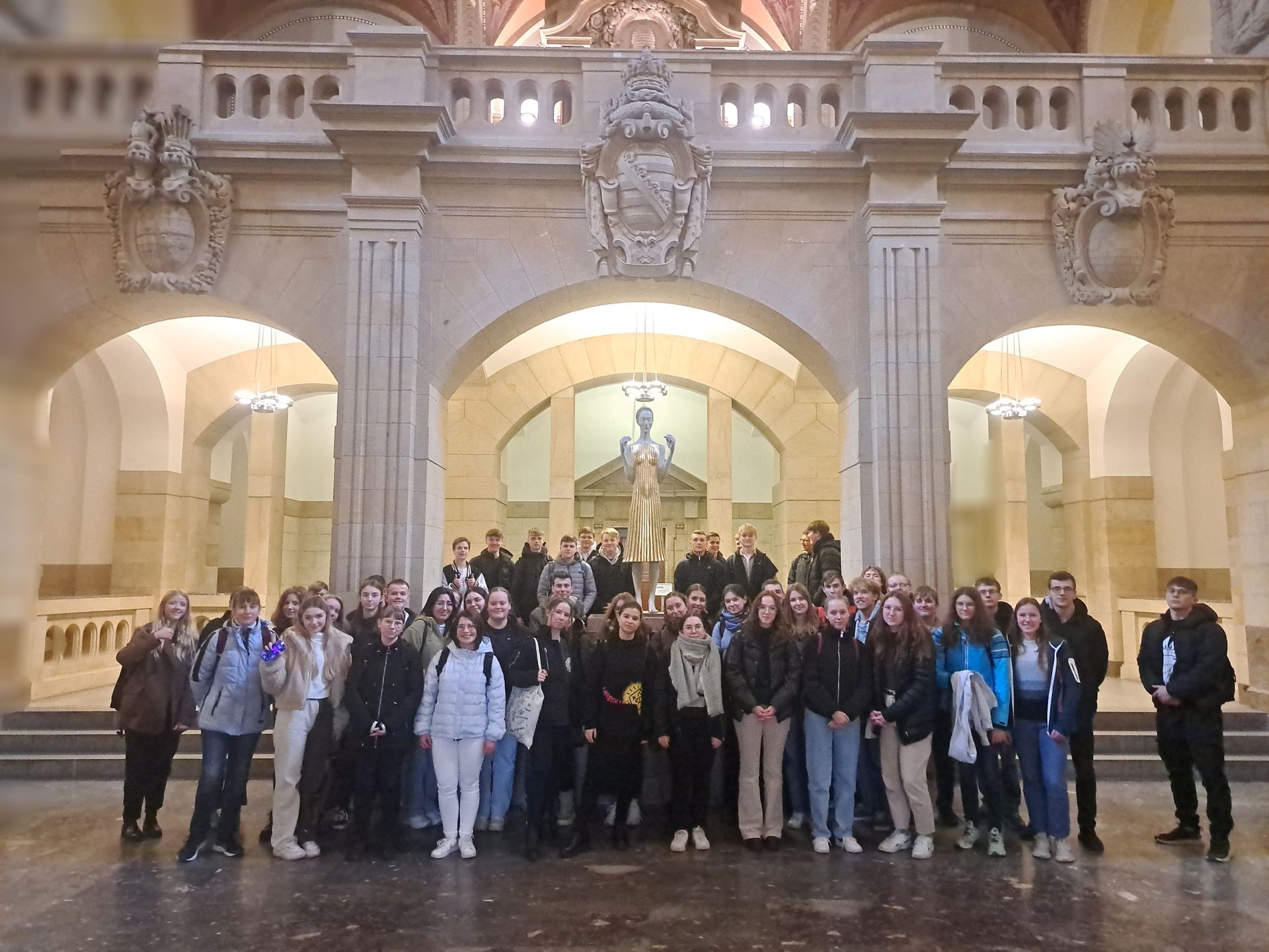 Was Ministerpräsident Kretschmer mir am 7.9. 2022 beim Bürgerdialog in der Aula des Werner-Heisenberg-Gymnasium Riesa mit seiner Einladung versprach, wurde am 11.1.23 Wirklichkeit. So traten 53 Schüler der 11. Jahrgangsstufe die Reise von Riesa in die Landeshauptstadt an. In der Staatskanzlei angekommen, stand zunächst eine Führung durch das Gebäude auf dem Programm.