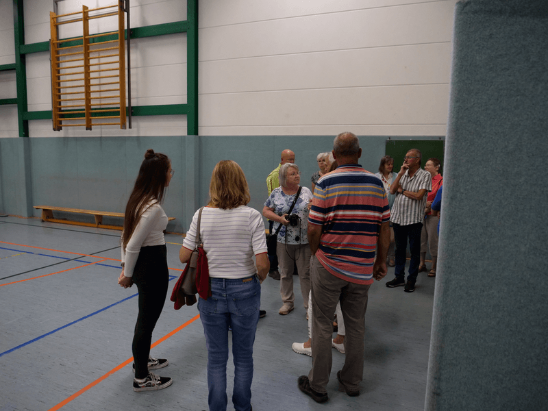 Während der Begehung der Aula wurde viel erzählt, Erinnerungen ausgetauscht und über Geschehenes oder eben nicht Geschehenes diskutiert. Umso gespannter waren unsere Gäste auf die heutige moderne Turnhalle. Wie ich erfuhr, war auf ihrem Boden früher eine Schwimmhalle.