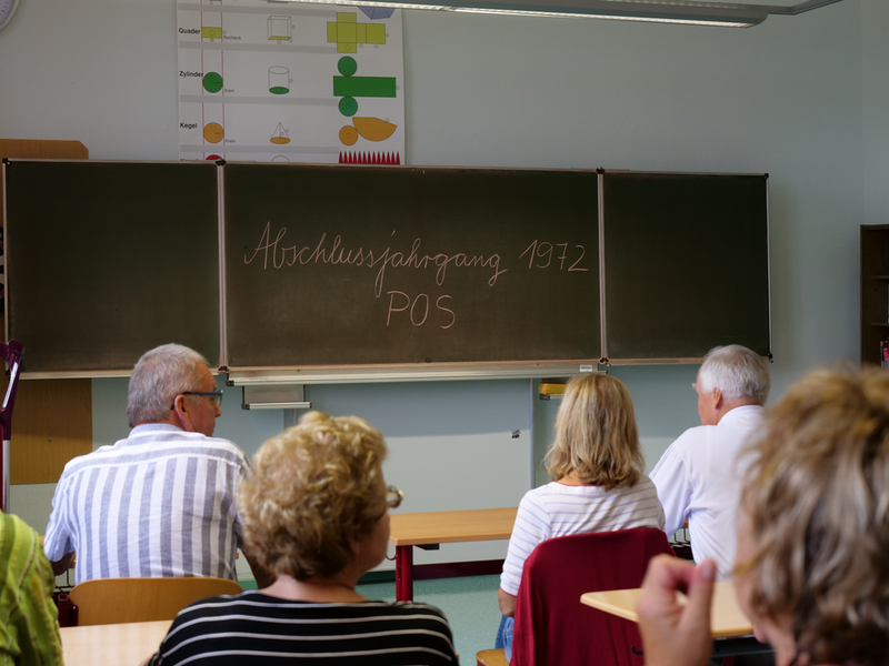 Mit voller Überzeugung und angespannter Erwartung betraten die Frauen und Männer ihr Klassenzimmer. Nach 50 Jahren wurde überrascht festgestellt, dass es sogar ein Sofa in der Ecke gibt. Der Nostalgie halber stellten wir die Tische nochmals um, sodass sich jeder an seinen alten Platz setzen konnte. Es wurden mehrere Klassenfotos geschossen und reichlich über den Unterricht damals diskutiert.