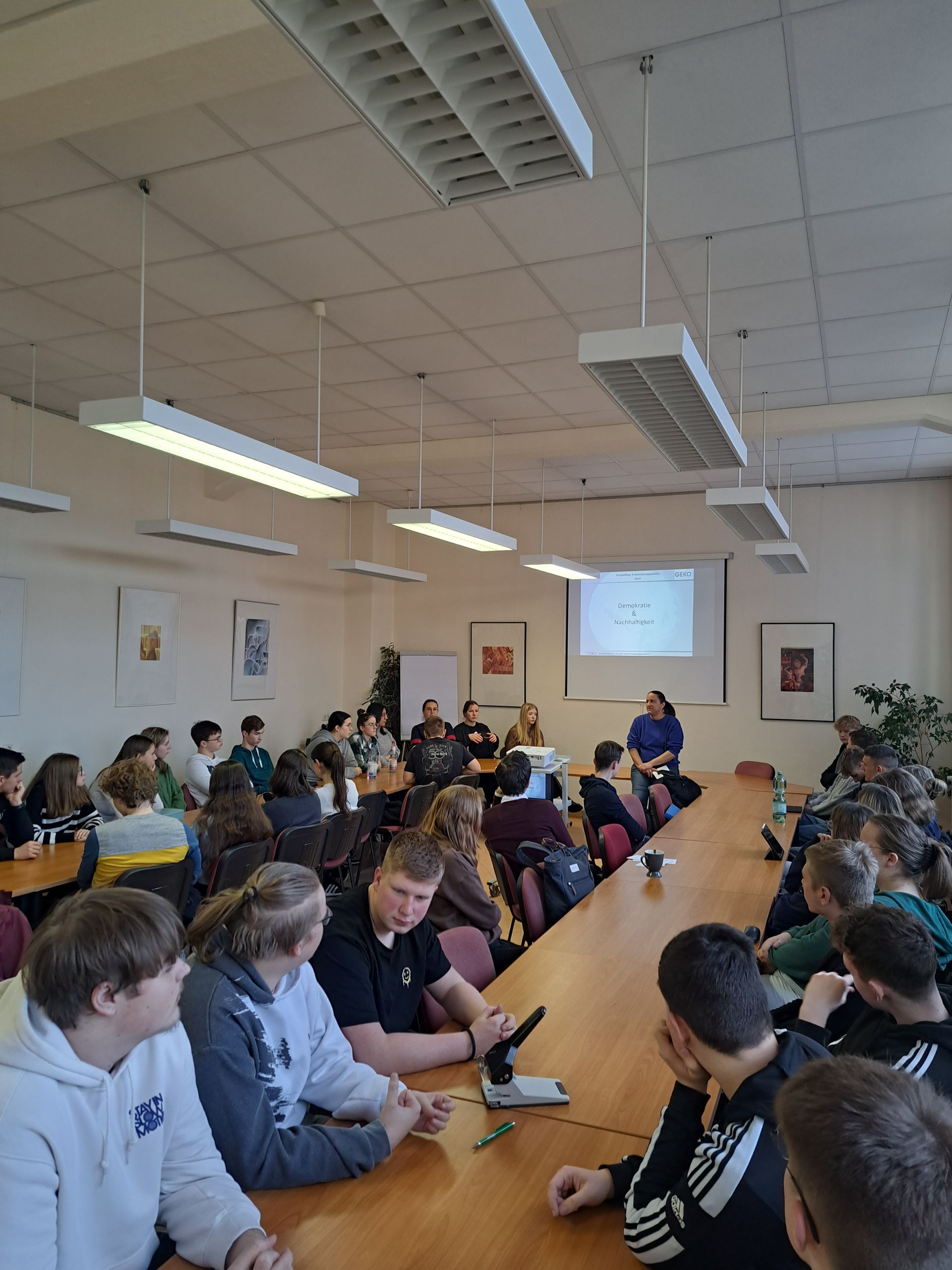 kleine Einführung in die Thematik „Demokratie und Nachhaltigkeit“, wobei die Schwerpunkte der Projektarbeit vorgestellt wurden. An verschiedenen Karten wurde demonstriert, vor welchen Herausforderungen die Menschheit angesichts der drohenden Klimakatastrophe steht. Auch politische Lösungsansätze wie die „17 Ziele für nachhaltige Entwicklung“ der Agenda 2030 der UNO wurden vorgestellt, die für die weitere Projektarbeit relevant sein sollten.