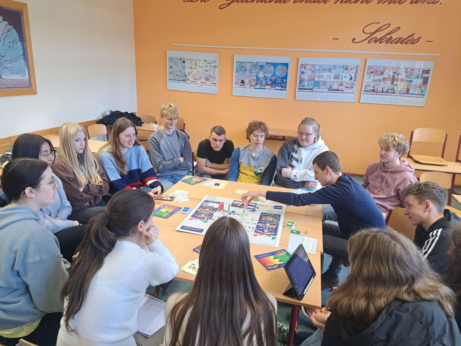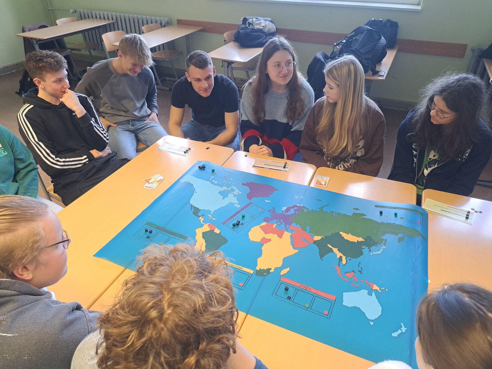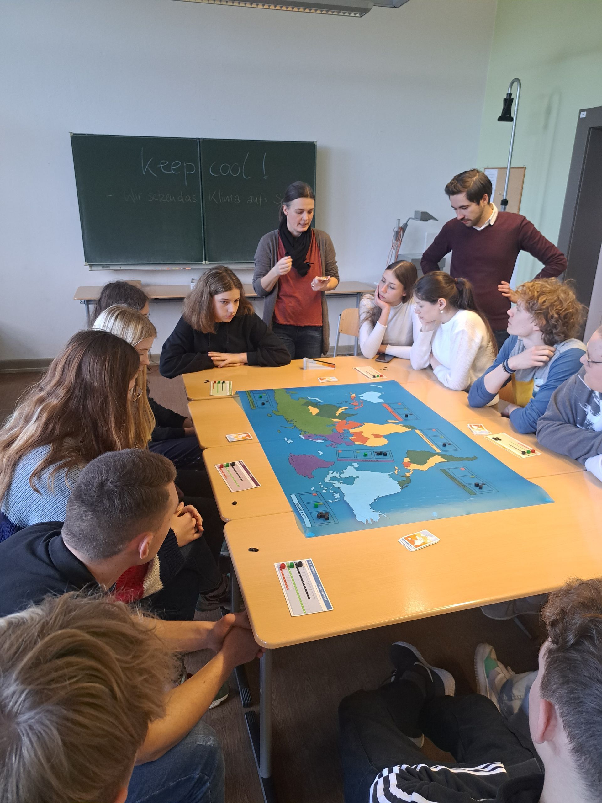 Im allerersten Workshop empfing Nadine Jeschke die Schüler, um ein Brettspiel unter dem Thema „Keep cool - Wir setzen das Klima aufs Spiel" zu spielen. Dabei handelt es sich um ein Gesellschaftsspiel rund ums Klima, bei dem spielerisch die jugendliche Weitsicht über