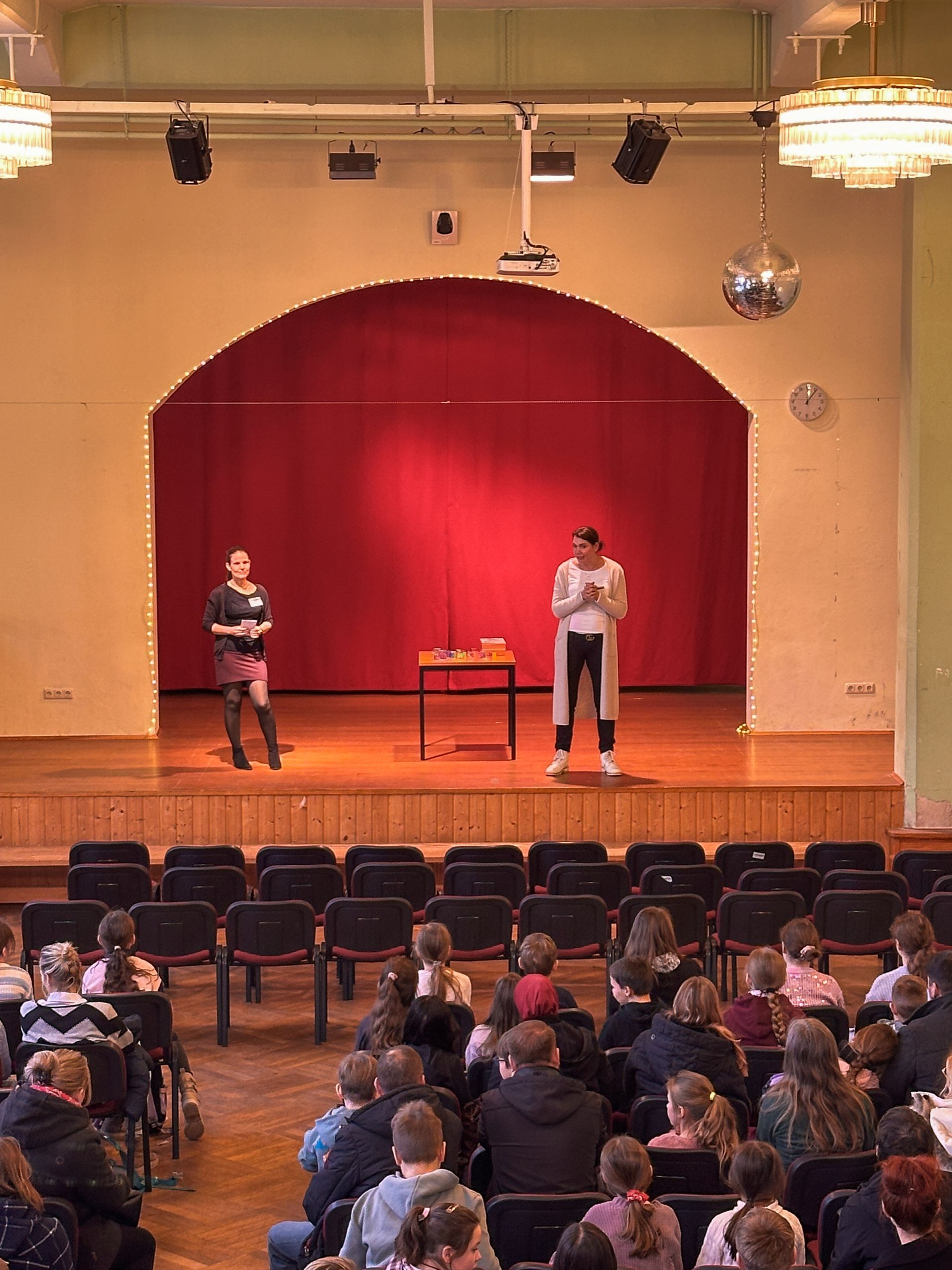 Um den Eltern die Wartezeit zu versüßen, fand parallel zur Schülerveranstaltung ein Elterncafé statt. In ungezwungener Atmosphäre konnten sich die Eltern über unser Schulleben und die außerschulischen Angebote informieren, das Schulgebäude bei einer kleinen Führung erkunden sowie mit der Schulleitung, dem Kollegium und Vertretern des Eltern- und Schülerrates ins Gespräch kommen. Auch der Förderverein unserer Schule, dem die Leckereien und Preise zu verdanken waren, stellte sich vor.