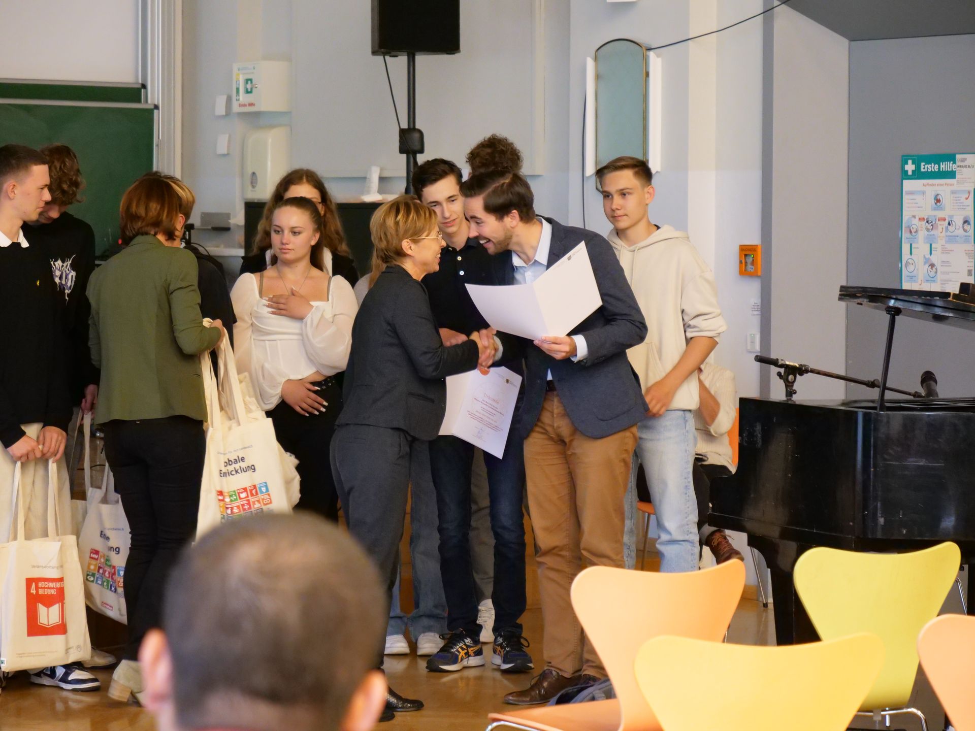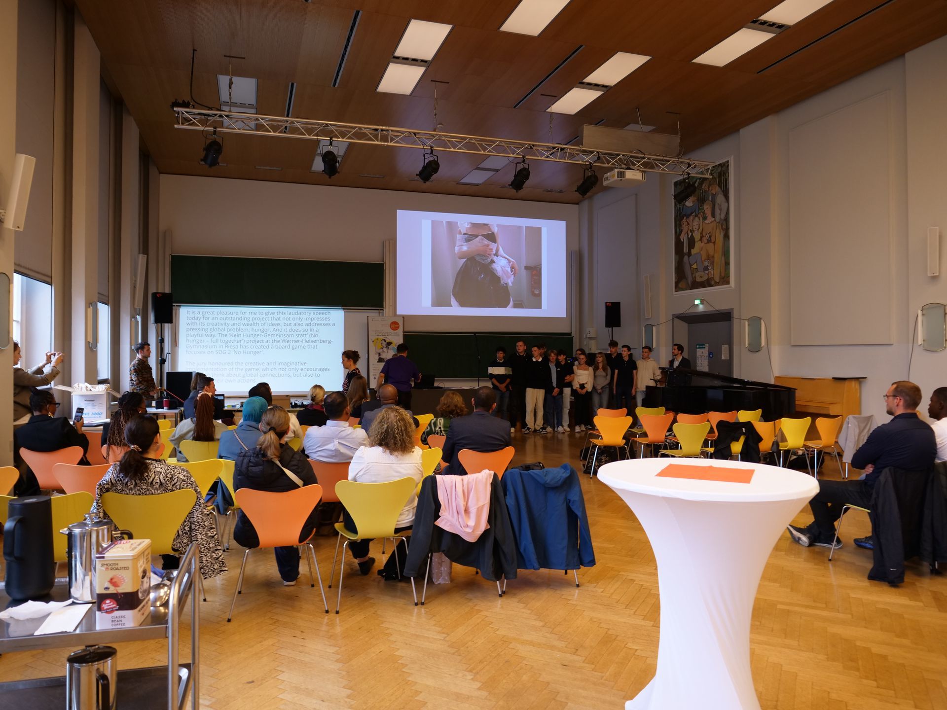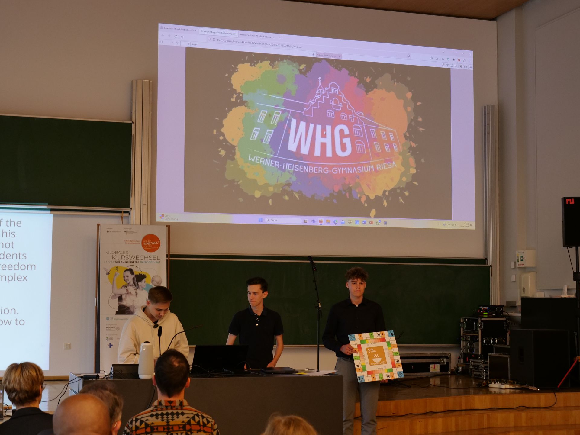 Die Preisverleihung von Engagement Global an der Technischen Universität Dresden war ein inspirierendes Ereignis, das nicht nur die herausragenden Leistungen der Preisträger würdigte, sondern auch ein internationales Publikum zusammenbrachte. Die Veranstaltung fand in einem festlichen Rahmen statt, der die Vielfalt und den interkulturellen Austausch förderte. Neben der öffentlichen Preisverleihung mit Übergabe der Urkunden und kleinen Geschenken durch Vertreterinnen des Staatsministeriums für Kultus und der anschließenden kurzen Vorstellung unseres Spiels durch Florian Wingsch und Jonas Babel, war es genau dieses internationale Flair, was uns nachhaltig in Erinnerung bleiben wird.