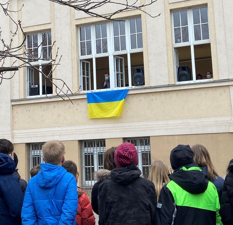 Nach der Ansprache wurde dann das Lied ,,Dona nobis pacem“ dreistimmig gesungen. Außerdem hatte eine der zehnten Klassen am Vortag die Chance, per Videoschalte mit der Ukrainerin Julia Lyashko zu sprechen, die Herr Wendt schon seit vielen Jahren – seit einem Schüleraustausch – kennt und mit der er in regelmäßigem Kontakt steht. Die Frau erzählte, wo sie wohnte und wie die Situation bei ihr war. Zu diesem Zeitpunkt war sie noch in ihrer Heimatstadt Obuchiw. Außerdem berichtete sie, dass es zu diesem Zeitpunkt in ihrer Stadt noch erträglich war, da diese unter ukrainischer Militärhoheit stand. Des Weiteren sprach sie über ihre Einstellung zu Russland, ebenso wie zum Westen und dass sie den westlichen Nationen sehr dankbar ist, weil diese ihr Heimatland doch nach besten Kräften unterstützt. Sie berichtete über ihre Familie und über ihre Verwandten in Russland, über ihr Leben vor dem Krieg und darüber, wie sie denkt, dass es nun weitergeht. Die Schüler*innen zeigten großes Interesse wie auch Mitgefühl.